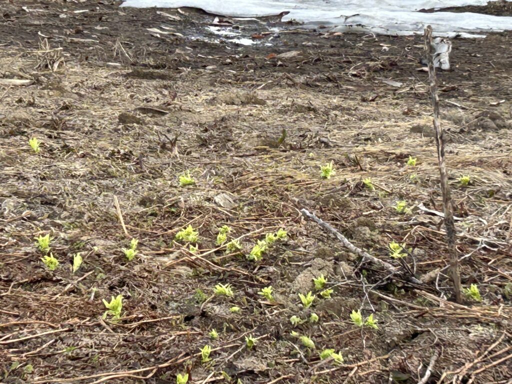 雪が消えたところからフキノトウ、コゴミが続々と姿をあらわしてきました。1日で様子がだいぶかわっています。